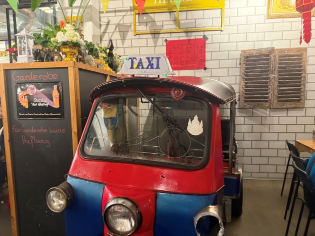 Die Location im Werksviertel ist ebenso sehenswert wie lebendig. Schon beim Betreten fällt die farbenfrohe Dekoration im Stil der thailändischen Kultur ins Auge – Laternen, Wandmotive und warme Holzelemente schaffen ein authentisches Ambiente. Besonders charmant ist der kleine Verkaufsstand für thailändische Lebensmittel, der zusätzlich Streetfood-Charakter vermittelt. Die bunt gestalteten Tische stehen relativ eng beieinander und sorgen für eine dynamische, gesellige Atmosphäre, wie man sie von thailändischen Märkten kennt.